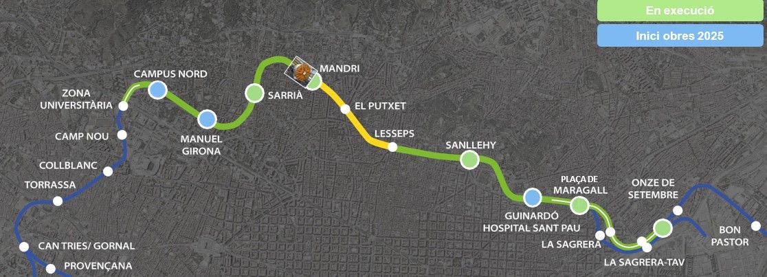 En el marco de las obras de la línea 9/10 se está trabajando actualmente en las estaciones de Mandri, Sarrià, Plaza de Maragall y Sanllehy, así como en el ámbito del macropozo de La Sagrera. En paralelo, están en marcha los trabajos para la colocación de la losa intermedia del túnel, la que separará un sentido de otro en la circulación de los trenes, entre el ámbito de plaza de Maragall y Lesseps. La tuneladora del tramo central está actualmente en Mandri, donde se están realizando las tareas de mantenimiento y puesta a punto necesarias antes de encarar el tramo pendiente hasta Lesseps.