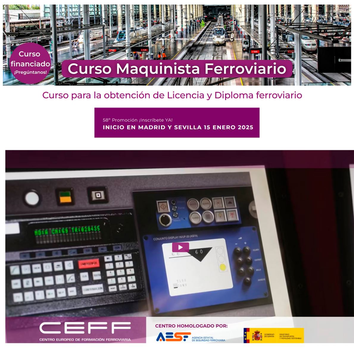 A mediados del mes que viene, 15 de enero, Ceff comienza a impartir en sus sedes de Madrid y Sevilla un nuevo curso para la obtención de licencia y diploma ferroviario para maquinistas. Con horario entre las 8,30 y las 14,30 horas, los alumnos harán las prácticas con simuladores de conducción Asfa y ERTMS propios de Ceff, así como prácticas de conducción reales en trenes de diversas operadoras.