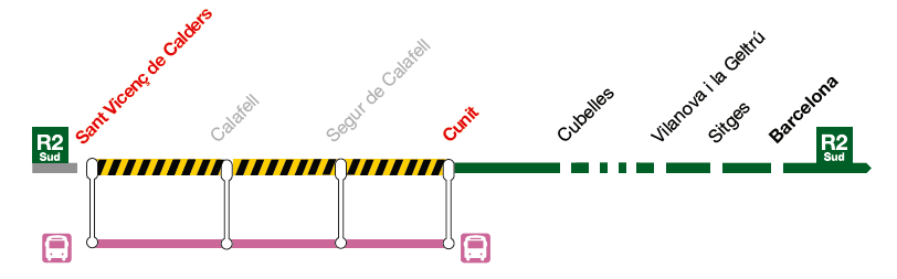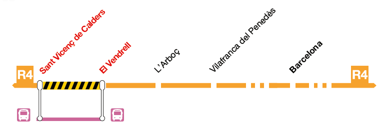 En la R2 Sud los autobuses circularán entre Sant Vicenç de Calders y Cunit, con paradas en Calafell y Segur de Calafell, mientras que, en el caso del R4, los autobuses enlazarán las estaciones de Sant Vicenç de Calders y El Vendrell. Por su parte, los viajeros de los servicios regionales dispondrán de autobuses para hacer el trayecto hasta Barcelona.