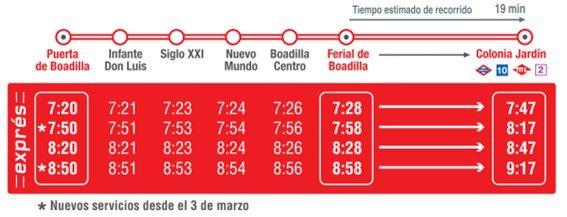 Desde ayer, se han aplicado ligeras modificaciones en los horarios de los servicios con salida desde Puerta de Boadilla a las 7.47 y 8.46 horas, que se han transformado en servicios exprés, ofreciendo trayectos directos entre Ferial de Boadilla y Colonia Jardín.