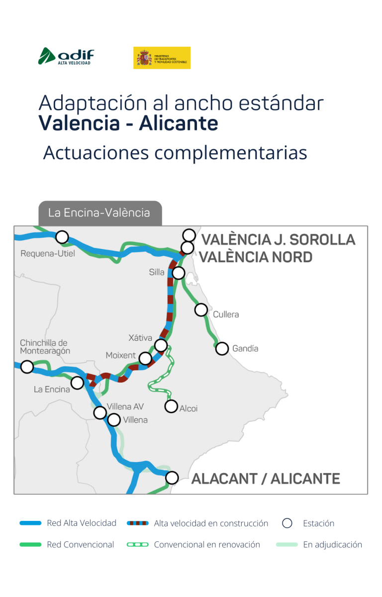El Ministerio de Transportes y Movilidad Sostenible ha adjudicado por más de 15 millones de euros, IVA incluido, un contrato para completar las obras que actualmente se ejecutan en el tramo de 122 kilómetros entre La Encina-Játiva-Valencia, en la Comunidad Valenciana, para implantar el ancho estándar en este eje estratégico del Corredor Mediterráneo y permitir la circulación en alta velocidad.