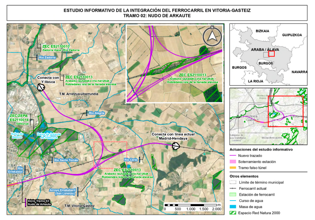 El trazado objeto del estudio conecta el final del tramo denominado ‘Acceso a Vitoria’, en el entorno del cruce de la actual vía Madrid-Hendaya con el río Errekaleor, con el tramo de la línea de alta velocidad ya ejecutado en Arratzua/Ubarrundia-Legutiano I, en el entorno de las localidades de Cerio y Arcaute. Dando así continuidad también a la línea convencional Vitoria-Alsasua-Pamplona.