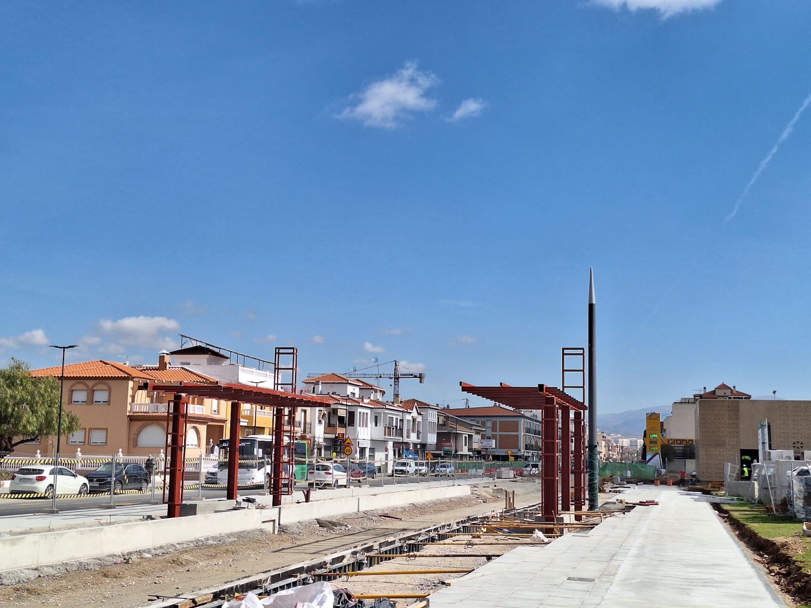Los primeros postes se están instalando en el tramo de la calle Santa Lucía/Parque de la Paz, en Churriana de la Vega, que es donde las obras de la prolongación sur están más avanzadas. Una vez finalizados los trabajos de excavación y relleno de la plataforma tranviaria, se están instalando los carriles vía junto a los postes de catenaria. Además, se está trabajando en las cimentaciones y fosos de la parada de la Paz, que ya cuentan con la estructura metálica que conformarán las marquesinas, así como en la ejecución del pavimento de la reurbanización.