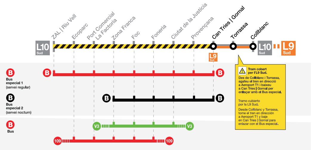 Otras opciones son la línea de bus urbano V3, que cubre el tramo afectado entre Zona Franca y Ciutat de la Justícia y la línea de bus 109, que cubre el tramo entre Ecoparc y Foneria.