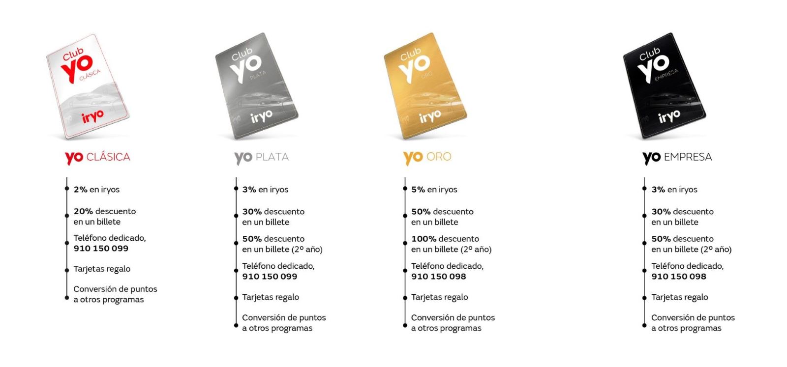 - Yo Singular pasa a ser Yo Plata: acumulación del 3 por ciento en iryos por compras, 30 por ciento de descuento en un billete y 50 por ciento a partir del segundo año, tarjetas regalo y conversión de puntos a otros programas.