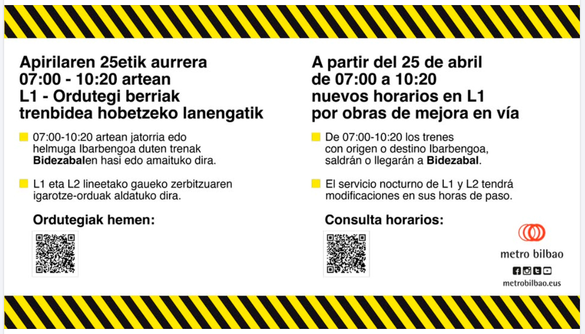- En horario laborable de invierno (del 28 de abril al 30 de junio y del 1 de septiembre al 30 de octubre) y en hora punta (entre las 7.35 y las 10.16 horas), los trenes con destino Ibarbengoa finalizarán el servicio en Bidezabal. Al adelantar la cabecera en la que los trenes dan la vuelta, se consigue recuperar el tiempo perdido como consecuencia de la necesidad de reducir la velocidad de la marcha en el tramo en obras.