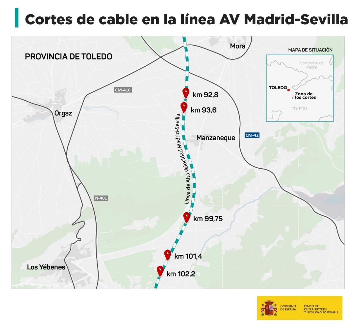 Las diligencias practicadas apuntan a cinco cortes de cable en Toledo, en una acción coordinada y deliberada. Los artífices han roto la alambrada y actuado en cinco puntos con cajas de seguridad en un radio de 12 kilómetros, en los términos municipales de Los Yebenes -puntos kilométricos 102/200, 101/400 y 99/750- y Manzaneque -puntos kilométricos 92/800 y 93/600. Los cortes afectaron a las instalaciones de señalización de la línea, lo que provocó importantes retrasos en el servicio. Los equipos de mantenimiento comenzaron a trabajar para subsanar la incidencia una vez finalizó el servicio ferroviario del domingo.