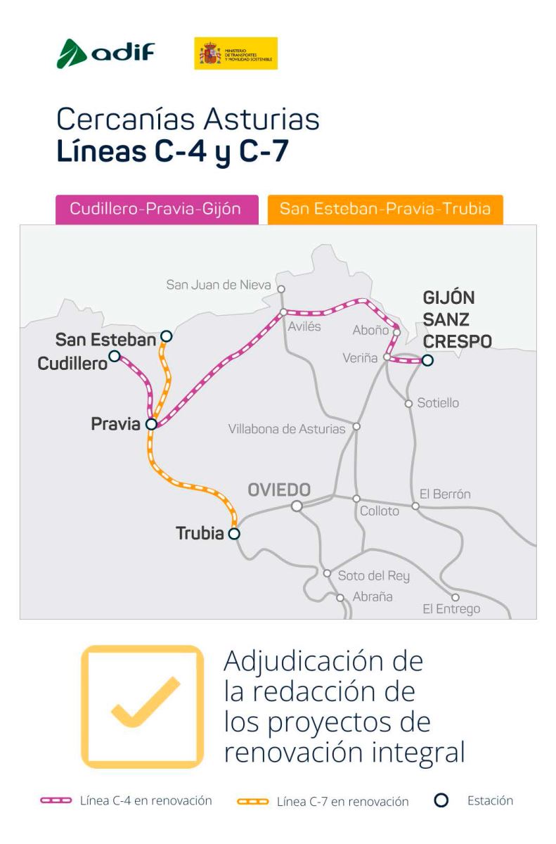 El Ministerio de Transportes y Movilidad Sostenible ha adjudicado por 5,3 millones de euros, IVA incluido, un contrato, a través de Adif, para la redacción de los proyectos de renovación integral de las líneas C4 y C7, en los 73 kilómetros del tramo Cudillero-Pravia-Gijón Sanz Crespo y en otros 39 kilómetros correspondientes al tramo San Esteban de Pravia-Pravia-Trubia, lo que supone un avance más en el desarrollo del Plan de Cercanías de Asturias.