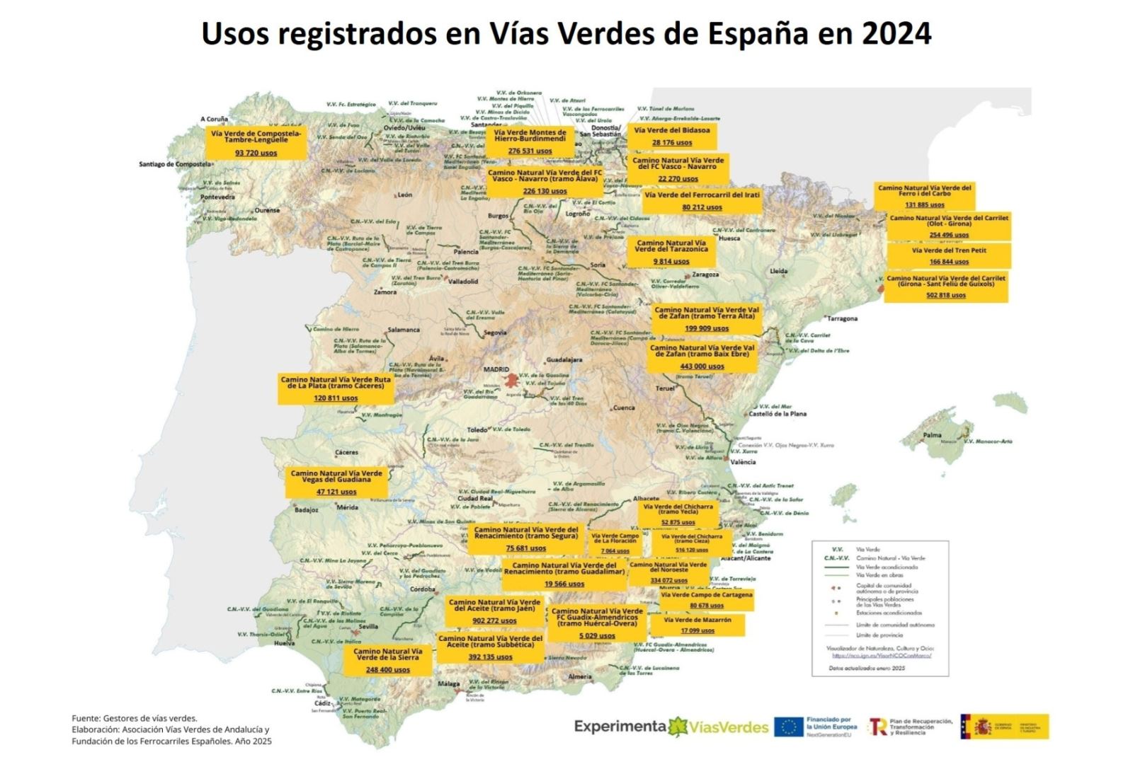 De las vías monitorizadas, la más utilizada en 2024 fue el Camino Natural Vía Verde del Aceite, con 902.000 usos en su tramo jienense, seguida por el Camino Natural Vía Verde del Carrilet, con 502.000 usos en su tramo entre Gerona y Sant Feliú de Guixols.