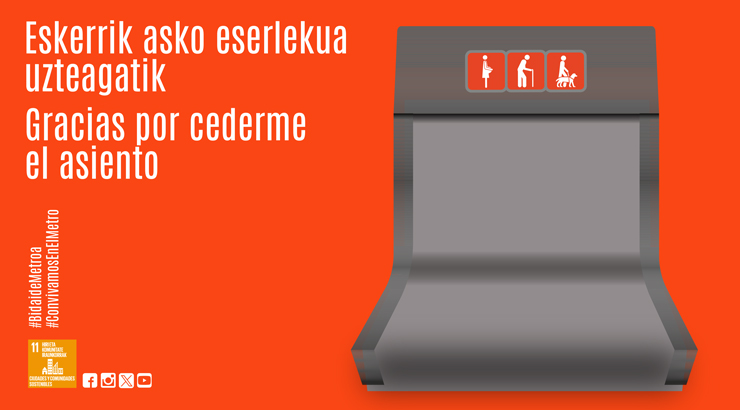 Con el fin de seguir concienciando sobre la importancia del respeto entre los viajeros, Metro Bilbao ha colocado en sus estaciones nueva cartelería con el mensaje ‘Gracias por cederme el asiento’. La iniciativa está dirigida a recordar que los asientos grises de los trenes están destinados a un colectivo concreto, en el que se incluyen personas mayores, personas con discapacidad, mujeres embarazadas y quienes viajan con perro guía (en este caso, los perros deben ir debajo del asiento).