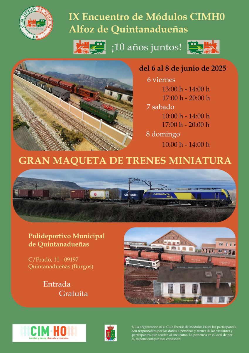 Desde hoy y hasta el próximo domingo a las 14 h, tendrá lugar el “Encuentro de módulos CIMH0 en Alfoz de Quintanadueñas, Burgos. El polideportivo municipal de la localidad acoge este encuentro que con entrada gratuita presenta una gran maqueta de trenes en miniatura.