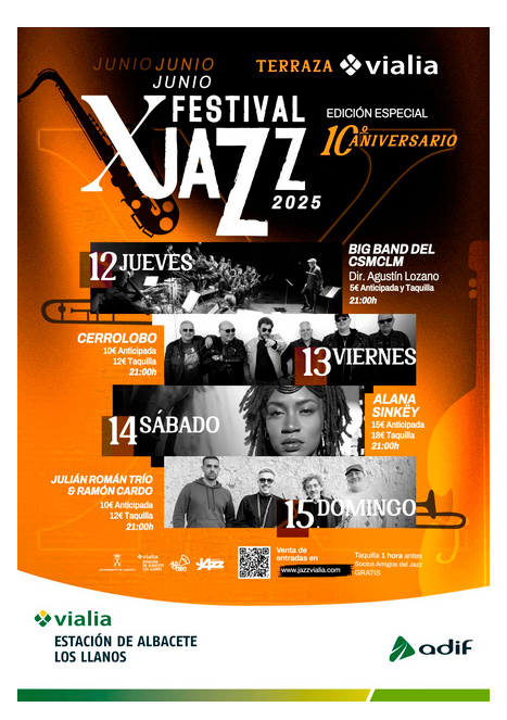 Ayer comenzó en el Vialia Albacete Los Llanos la décima edición del ‘Festival de Jazz Terraza Vialia’. Se trata de un festival que se celebra en la terraza de la estación y que ofrece una amplia variedad de estilos de jazz. Desde hoy viernes y hasta el domingo se celebrarán conciertos de primer nivel.