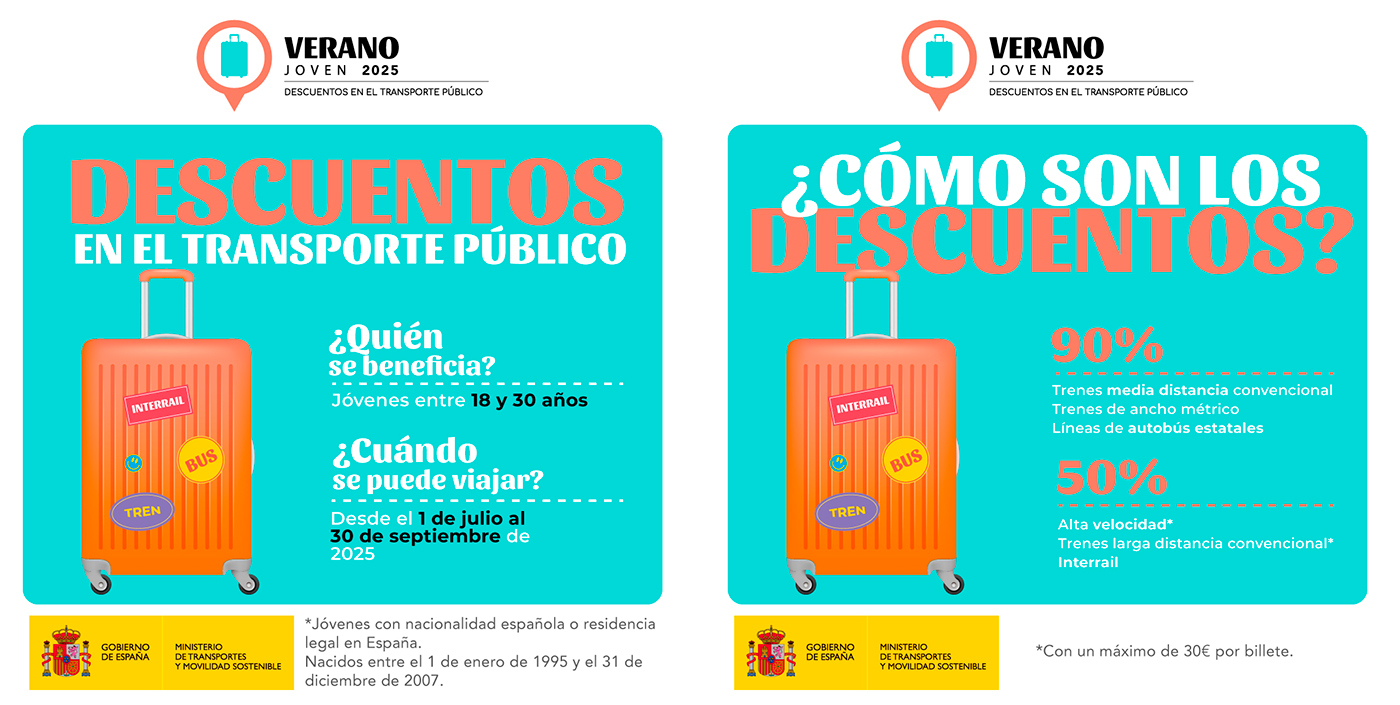 El Ministerio de Transportes y Movilidad Sostenible prevé destinar a este programa 120 millones de euros para cubrir las bonificaciones de los billetes sencillos y de ida y vuelta para viajar por España y también el Interrail por Europa. En esta edición de Verano Joven se podrán beneficiar de los descuentos todos los jóvenes nacidos entre el 1 de enero de 1995 y el 31 de diciembre de 2007, que podrán conseguir billetes de autobús y tren con descuento desde el 1 de julio al 30 de septiembre de 2025. Los descuentos incluidos en el programa Verano Joven son: