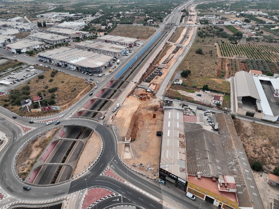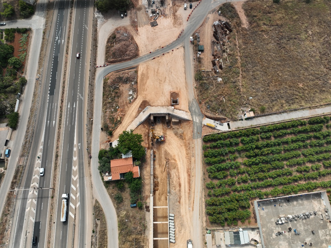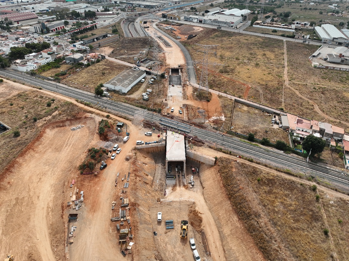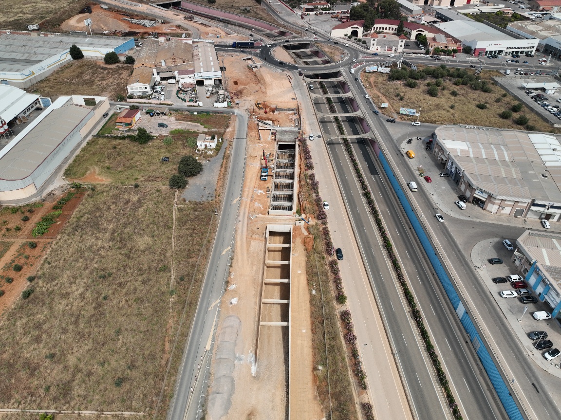 La CV-18 y la Acequia Mayor ya se han desviado provisionalmente para dar continuidad a las obras del falso túnel y, en el Camí de Pigrós, se está desviando una tubería de agua potable para poder ejecutar los pilotes correspondientes. Salvo en los tramos de discontinuidades (rampas de acceso o cruces de servicios programados) se ha excavado hasta el fondo del túnel y se han iniciado los trabajos de la red de drenaje.