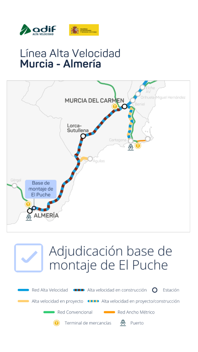 Adif Alta Velocidad ya ha adjudicado el montaje de la vía de alta velocidad en el tramo comprendido entre Murcia y Lorca, por un importe de 37,94 millones de euros y recientemente ha licitado el contrato correspondiente al tendido de las vías entre Vera y Almería, por otros 37,5 millones. Además de las actuaciones en la plataforma de la línea, este proyecto incluye la conexión con la base de montaje de El Puche.