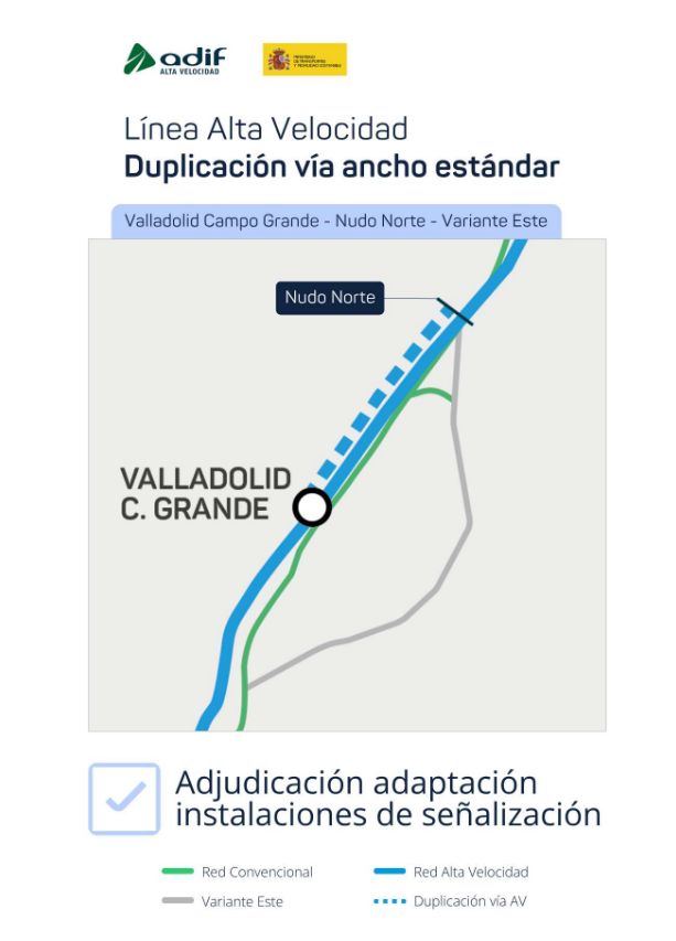 Adif Alta Velocidad ha adjudicado dos contratos para la adecuación de instalaciones de señalización de cara a la nueva configuración de vía doble en alta velocidad en el tramo entre la estación de Valladolid Campo Grande y el nudo Norte de Valladolid-Variante Este, con una inversión global de 23 millones de euros.