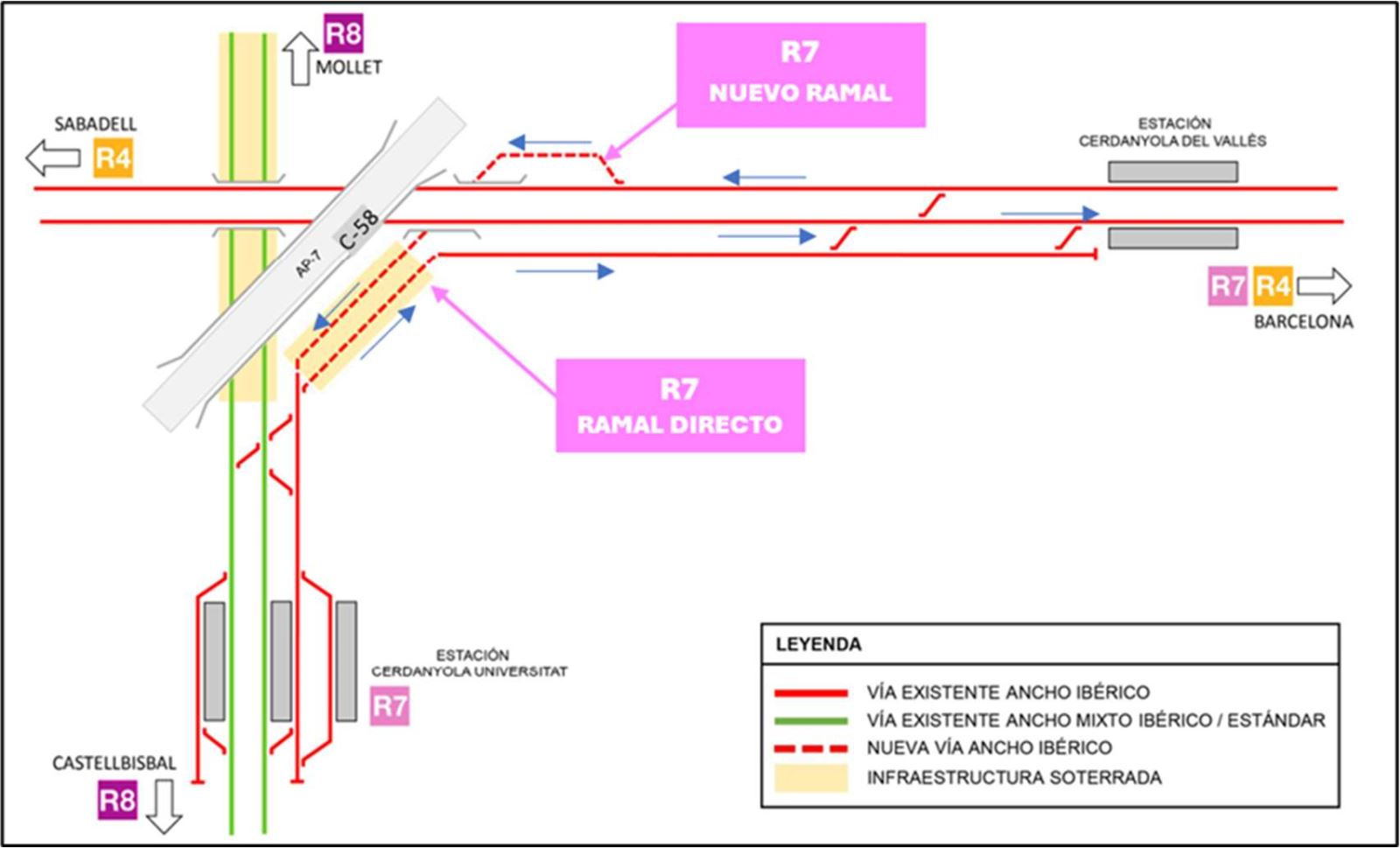 La actuación desarrollada en el estudio informativo consiste en el diseño de una remodelación de la actual conexión ferroviaria de la línea R7 con la R4 de Rodalies de Barcelona, en el término municipal de Cerdanyola del Vallès, para materializar un salto de carnero que elimine el cizallamiento existente en la actualidad. En concreto, se define un nuevo ramal en salto de carnero mediante un paso inferior que permita el cruce a distinto nivel de la línea R7 y la plataforma de la R4.