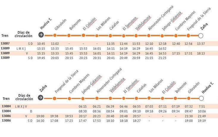 Esta programación se adapta a la rutina de movilidad de los viajeros que se desplazan por motivos laborales o académicos, y permitirán a los usuarios de la sierra realizar gestiones en la capital onubense de lunes a viernes, con un tren con salida de Jabugo a las 6.15 horas y llegada a Huelva a las 7.51 horas.  En sentido inverso, para el regreso circulará un servicio con salida de la capital onubense a las 15.15 horas. Ambos trenes tendrán paradas intermedias en Almonaster Cortegana, Valdelamusa, El Tamujoso, Calañas, Los Milanos, El Corbujón, Belmonte y Gilbraléon.