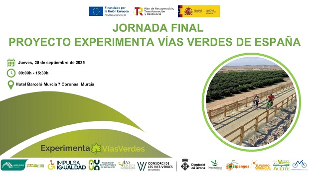 El próximo jueves, 25 de Septiembre de 2025 se celebra la jornada final del proyecto ‘Experimenta Vías Verdes’ en Murcia. En este acto se presentarán los resultados y se establecerá un foro de debate.
