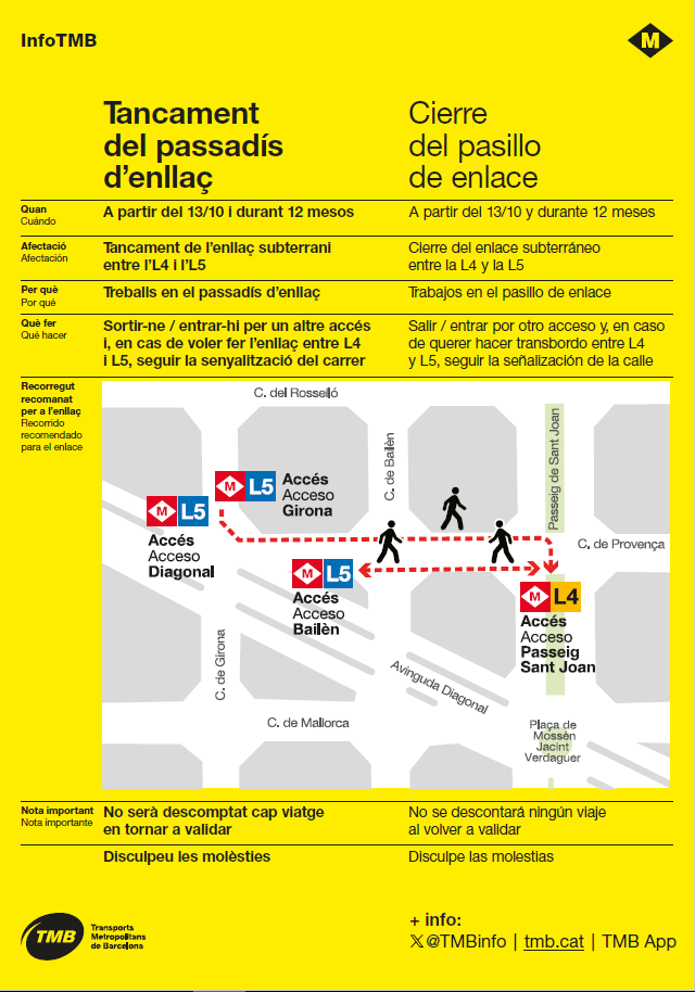 La eliminación de estas barreras arquitectónicas obligará a los usuarios de esta conexión a realizar el transbordo entre líneas por la calle. Este deberá hacerse desde el Passeig de Sant Joan —si el transbordo se hace desde la L4— y por la calle Provença hasta el acceso de la L5 situado en el cruce con la calle Bailèn, o a la inversa si el origen es la L5. Tanto en las salidas desde la L4 y la L5 como a pie de calle, los recorridos del transbordo estarán debidamente señalizados y no se descontará ningún viaje al volver a validar.