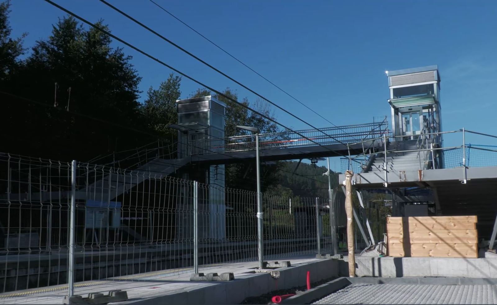 La supresión del paso a nivel entre andenes se resolverá con una pasarela peatonal que cruza sobre las vías del ferrocarril para acceder al andén sur, en dirección a Bilbao. El tablero de la estructura está situado a una cota de aproximadamente 5 metros desde la rasante del andén y está fabricado en acero en su mayor parte.