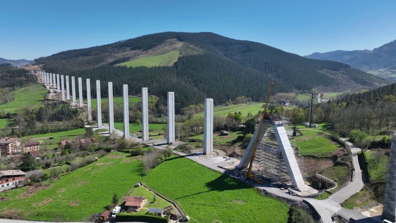 (10/10/2025) El viaducto de Arrazola, de 1.755 metros, es el de mayor longitud de todos los pertenecientes a la línea de alta velocidad Vitoria-Bilbao-San Sebastián. Distribuido en 27 vanos de hasta 66 metros de luz, la sección transversal del tablero está constituida por un cajón de hormigón postesado, con canto constante de 4,40 metros.