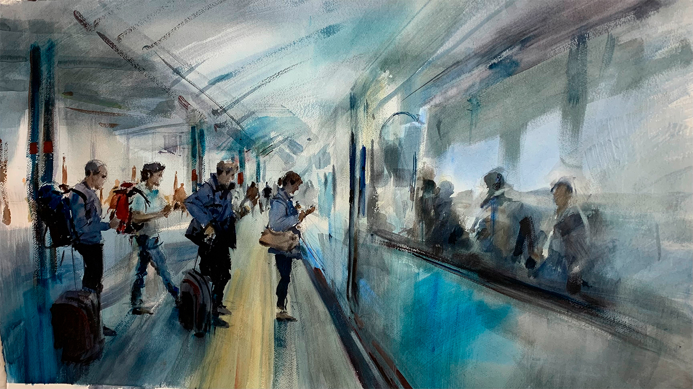 La exposición invita al visitante a recorrer el universo del ferrocarril a través de una cuidada selección de treinta y una acuarelas, que capturan, con maestría la esencia y la estética del ferrocarril en sus distintas formas y espacios. Vehículos, estaciones, pasajeros, paisajes… todo emerge como símbolo, como recuerdo diluido en capas de memoria translúcida de color.