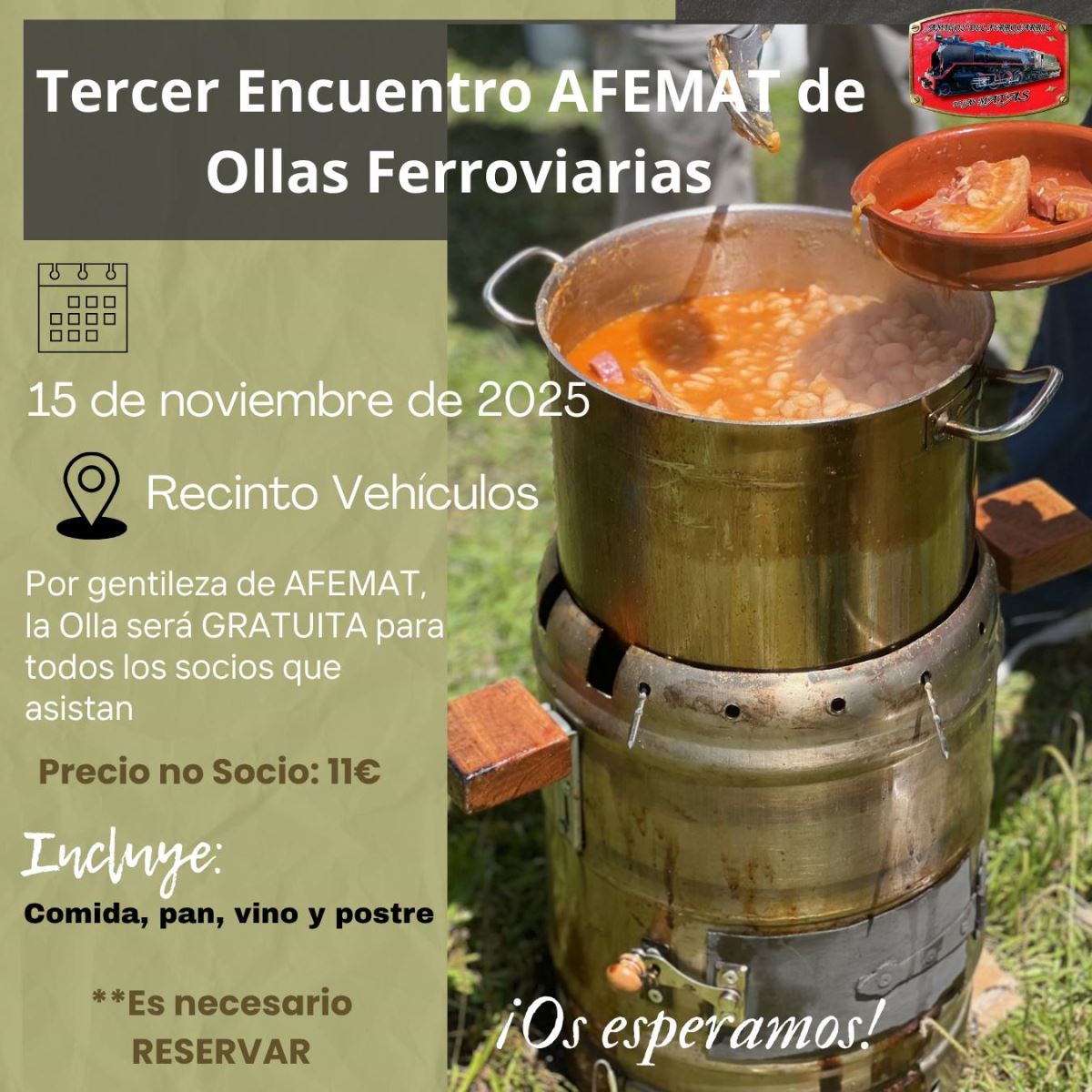 El sábado 15 de noviembre de 2025, la Asociación de Amigos del Ferrocarril de Las Matas organiza el Tercer Encuentro AFEMAT de Ollas Ferroviarias. La cita, que tendrá lugar en el Recinto de Vehículos, reunirá a socios y aficionados en torno a una de las tradiciones más populares del mundo ferroviario: la cocina en olla ferroviaria.