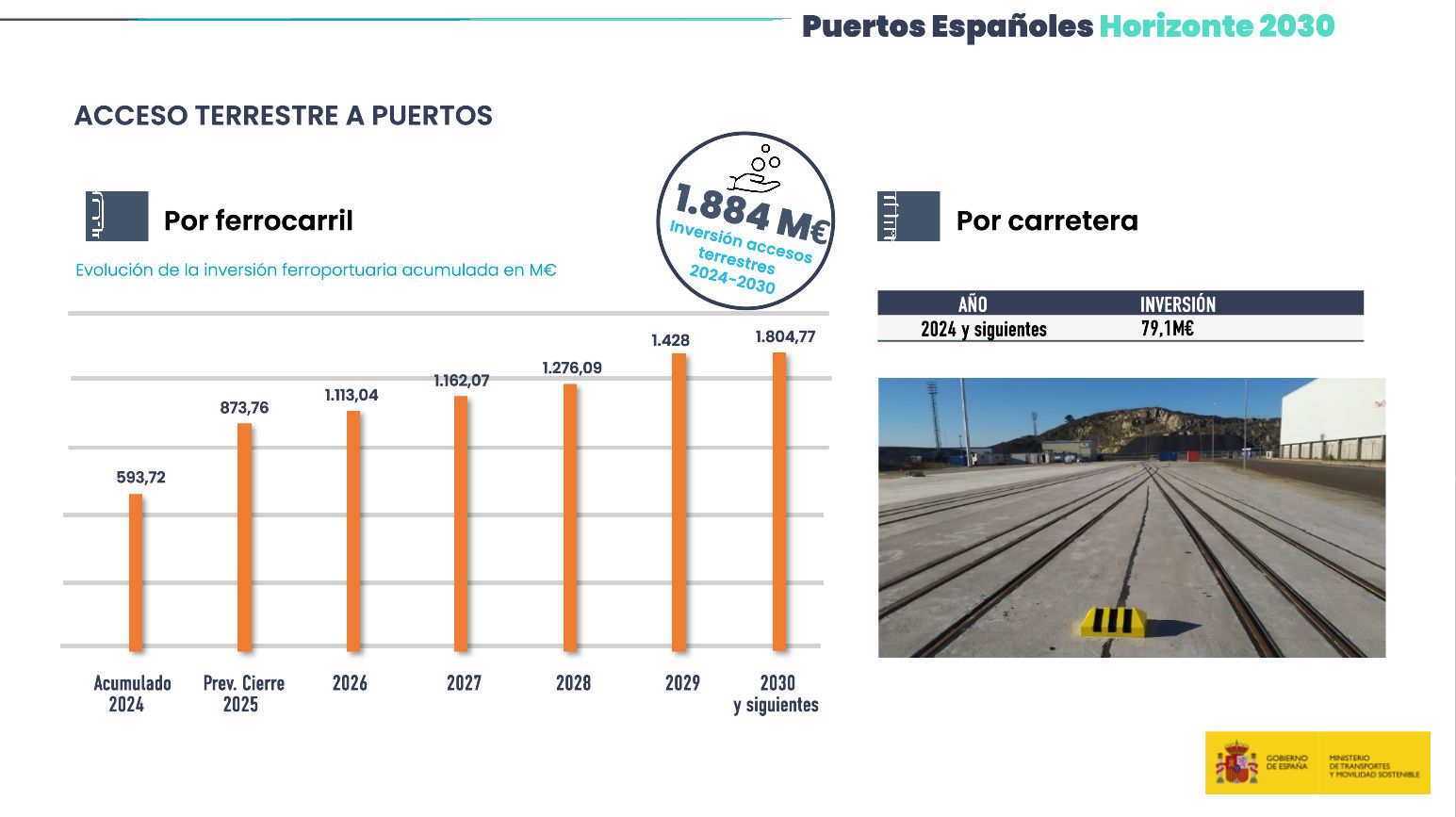 De los más de 7.000 millones de euros que se invertirán hasta 2029 en los puertos estatales, más de 950 se destinarán al desarrollo y mejora de los accesos viarios y ferroviarios a los puertos, ya que garantizar su conectividad es fundamental para no perder competitividad.