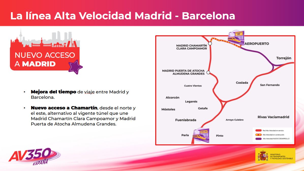 El ministro de Transportes y Movilidad Sostenible, Óscar Puente, anunció ayer la licitación por 2,3 millones de euros del contrato para desarrollar dos estudios de viabilidad que tienen el objetivo de analizar actuaciones de mejora de la línea de alta velocidad Madrid-Barcelona para aumentar la velocidad de este corredor a 350 km/h y reducir la distancia entre ambas ciudades a menos de dos horas. Además, los estudios incluyen nuevas variantes de acceso a ambas capitales y la ejecución de dos nuevas estaciones de alta velocidad en Parla y en el Prat de Llobregat. (Descargar presentación proyecto)