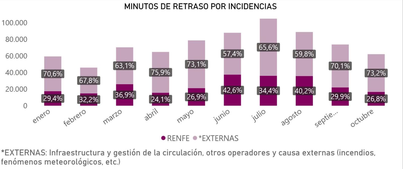 Debido a que en ocasiones surgen situaciones que impiden que un tren llegue puntual a su destino, se ha incorporado un nuevo indicador a los datos de puntualidad. Este indicador muestra los minutos de retraso ocasionados por incidencias en el servicio e identifica si el origen del retraso corresponde a la propia compañía o a factores externos, como averías en la infraestructura, por gestión de circulación, alteraciones derivadas de incidencias de otras operadoras o condiciones meteorológicas adversas.