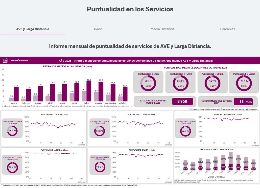 Renfe ha publicado los datos de puntualidad registrados en octubre en sus servicios de Alta Velocidad (AVE) y Larga Distancia, Avant y Media Distancia, y en los servicios de Cercanías y Rodalies. La operadora ha incorporado a estos informes mensuales un nuevo indicador que recoge los minutos de retraso ocasionados por incidencias en el servicio e identifica si el origen del retraso corresponde a la propia operadora o a factores externos.