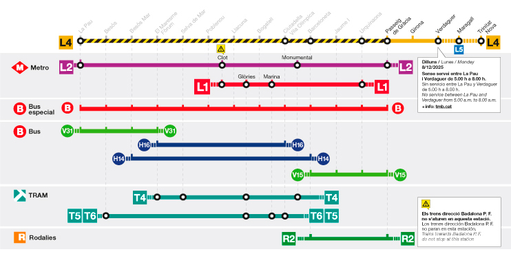 Para la afectación entre Sagrada Família y La Pau las últimas horas de servicio el viernes 5 (de 12.00 a 2.00 horas del sábado), las alternativas de transporte para moverse entre estas estaciones son las líneas de bus nocturno N8 y N9 de Tugsal.