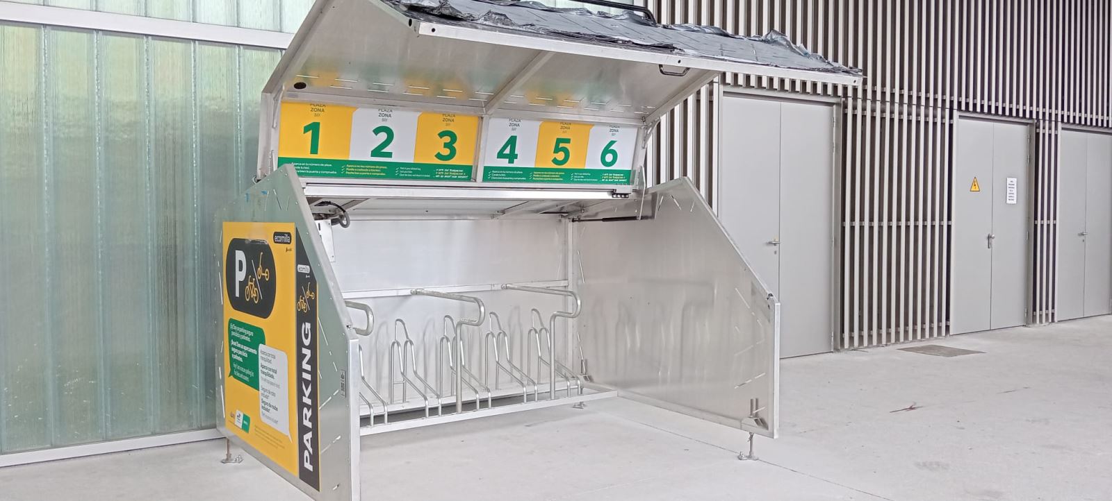 El aparcamiento, tipo modular, cerrado y cubierto, tiene capacidad para seis bicicletas y un bajo impacto visual. El modelo es sostenible y autónomo energéticamente y se alimenta con electricidad generada por instalaciones solares fotovoltaicas, que carga las baterías.