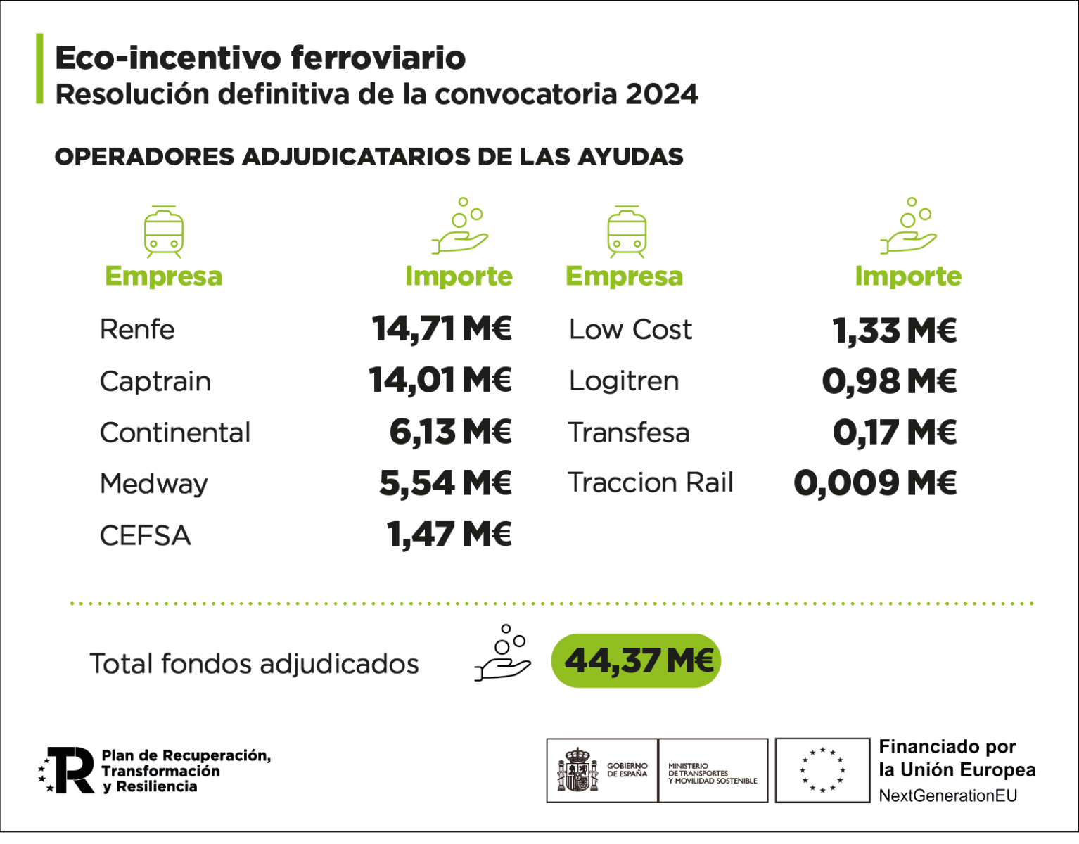 El Ministerio de Transportes y Movilidad Sostenible ha concedido 44,37 millones de euros a nueve operadores ferroviarios de mercancías, públicos y privados, en el marco de la tercera convocatoria de ayudas del programa de eco-incentivos ferroviarios del Plan de Recuperación, Transformación y Resiliencia (PRTR), correspondientes a los tráficos realizados en tren a lo largo de 2024.