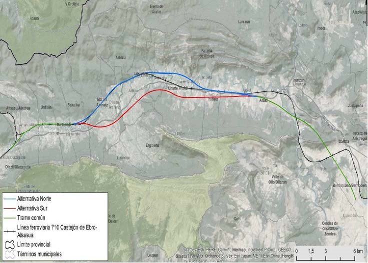 Las dos opciones que se barajan en este estudio discurren a través de la Comunidad Foral de Navarra, atravesando a su paso los términos municipales de Olatzi/Olazagutía, Altsasu/Alsasua, Urdiain, Iturmendi, Bakaiku, Etxarri Aranatz, Arbizu, Lakuntza, Arruazu, Uharte Arakil, Irañeta, Arakil e Iza/Itza. En la actualidad, ambas alternativas, denominadas Norte y Sur, se encuentra en fase de evaluación ambiental. Comparten en su inicio un tramo de unos 13 kilómetros de longitud, que da continuidad al trazado recogido en el “Estudio Informativo de la Red Ferroviaria de la comarca de Pamplona”. Seguidamente se encuentra un tramo de unos 20 kilómetros de longitud en el que el trazado de las dos alternativas se separa. En el mismo, la Alternativa Norte se define adosada al ferrocarril existente, Alsasua-Castejón de Ebro, a diferencia de la Alternativa Sur que presenta un trazado independiente para el que se habilita un nuevo corredor próximo a la autovía A-10.