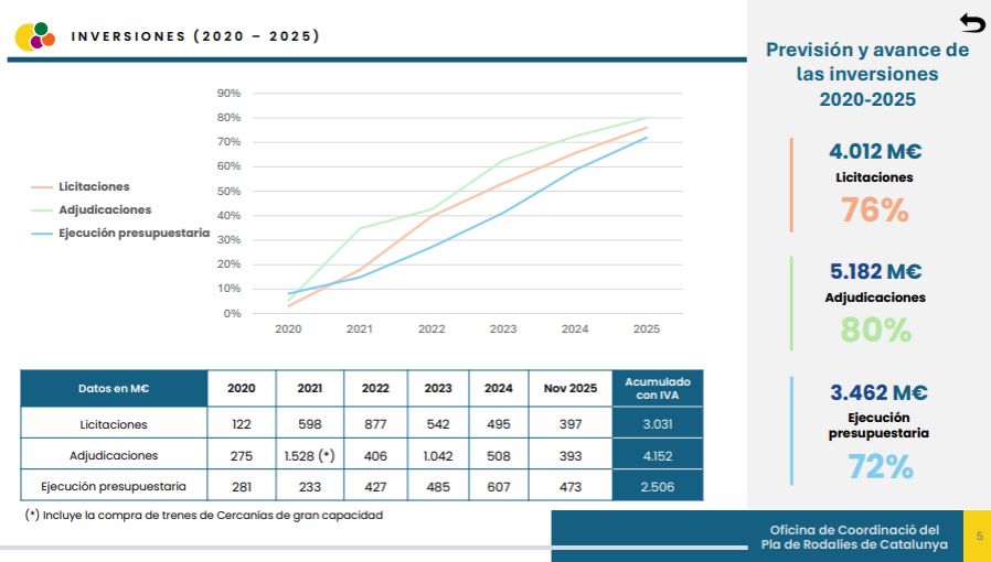 En 2025 se cumplieron cinco años de la puesta en marcha del Plan de Rodalies 2020-2030 por parte del Ministerio de Transportes y Movilidad Sostenible, con más de 2.500 millones de euros de inversión ejecutada hasta el momento para seguir mejorando la red ferroviaria en Cataluña. (Ver presentación del Balance 2020-2025 del Plan)