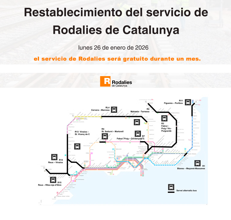 Hoy se retoma el servicio de Cercanías de Cataluña en las líneas R1, R2 y R4 -esta última comenzará con servicio alternativo por carretera y se recuperará a lo largo del día- después de completar las inspecciones y actuaciones necesarias para garantizar un funcionamiento seguro de la red. Todas las líneas de Rodalies estarán operativas con planes alternativos de transporte en autobús. (Consultar sobre el estado del servicio)