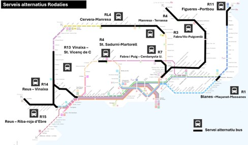 Mientras el servicio de Rodalies continue afectado por las obras de reparación de la infraestructura, Renfe, junto con el titular del servicio, la Generalitat de Catalunya, han diseñado diez  planes alternativos de transporte con autobuses para garantizar la movilidad en los próximos días. La operadora continúa trabajando de forma coordinada con Adif y la Generalitat de Catalunya para recuperar totalmente la circulación del resto de líneas y servicios regionales lo antes posible y con todas las garantías de seguridad.