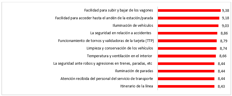 Loa aspectos mejor valorados por los usuarios son la accesibilidad (facilidad para subir y bajar de los vagones, con 9,38 puntos sobre 10 y facilidad para acceder hasta el andén, con 9,18), la iluminación de los vehículos (9,03 puntos) y la seguridad en relación a accidentes, con una puntuación de 8,86.
