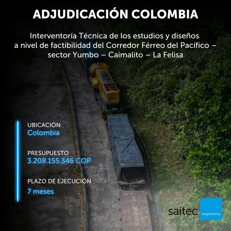 La Agencia Nacional de Infraestructura (ANI) de Colombia ha seleccionado al consorico formado por Saitec e Incoplan para la ‘Interventoría Técnica de los estudios y diseños a nivel de factibilidad del Corredor Férreo del Pacífico, sector Yumbo-Caimalito-La Felisa”.