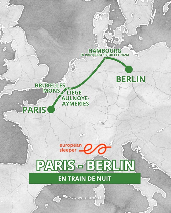 (06/04/2026) El primer tren nocturno París-Berlín que ha incorporado European Sleeper a su oferta restablece un servicio que se había cerrado.  La primera salida fue el 26 de marzo desde la Gare du Nord, en París. Este acto reunió a socios, responsables políticos y del sector. Este servicio tiene tres salidas semanales, martes, jueves y domingos en dirección París a Berlín, y lunes, miércoles y viernes en dirección Berlín – París.