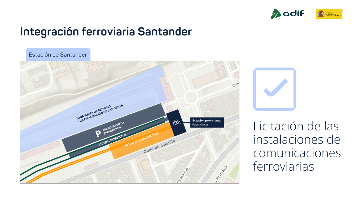 Recientemente Adif adjudicó por 37,8 millones de euros las primeras obras del proyecto de integración del ferrocarril en Santander, el desvío y la estación provisional de la red de ancho convencional en la estación de la capital cántabra. Adicionalmente, se adjudicó la asistencia técnica para el control de las obras, por 1,7 millones de euros.