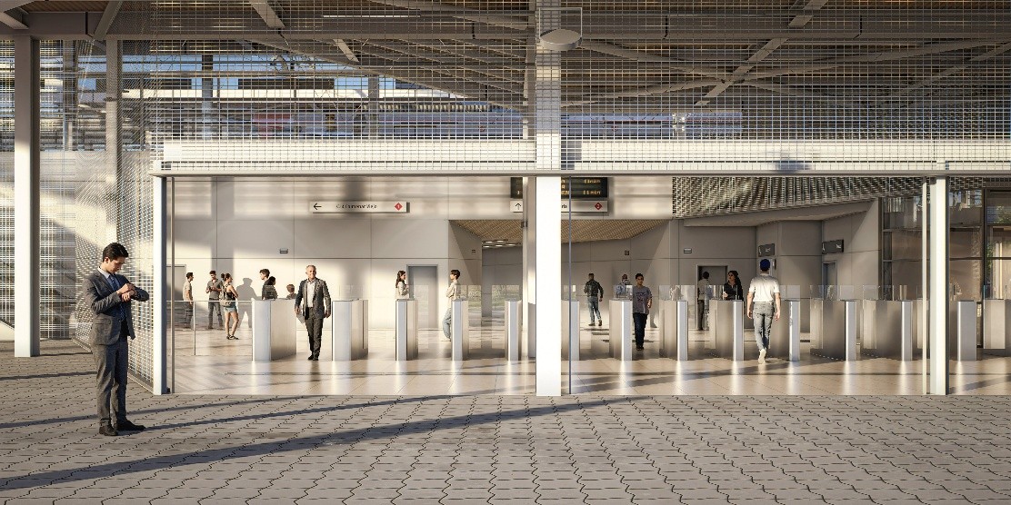 El edificio albergará un vestíbulo diáfano, aseos, diversos espacios para los trabajadores de la estación, tornos de acceso, máquinas autoventa y una cafetería con terraza.