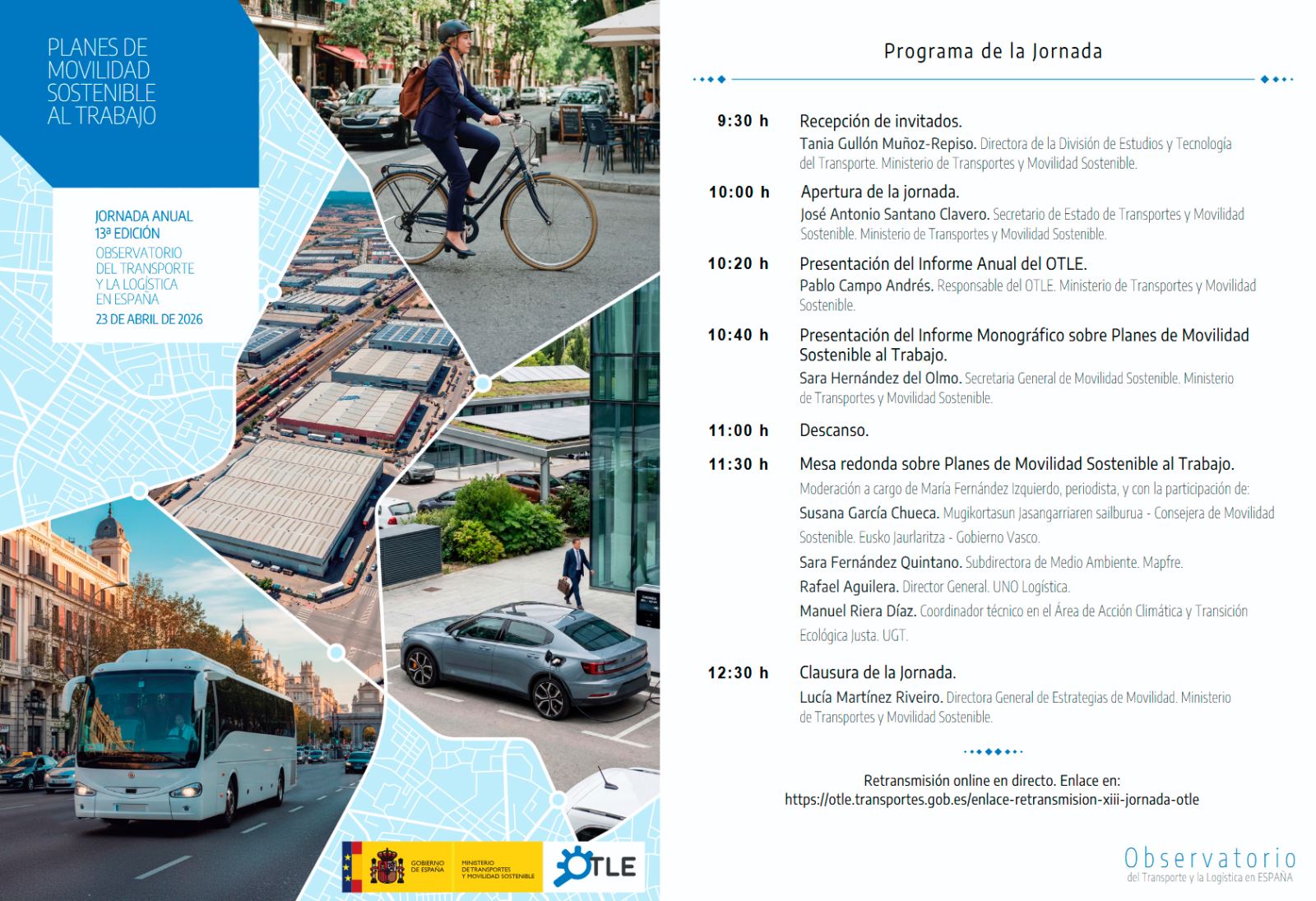 En la XIII Jornada del Observatorio del Transporte y la Logística en España, representantes del Ministerio de Tranportes y distintos agentes sociales abordaron la implantación de los Planes de Movilidad Sostenible al Trabajo. La apertura de la jornada corrió a cargo del secretario de Estado José Antonio Santano, quien subrayó que la movilidad laboral supone una cuarta parte de los desplazamientos diarios y destacó el compromiso del Ministerio para apoyar a las empresas en el desarrollo de los planes de movilidad sostenible al trabajo.