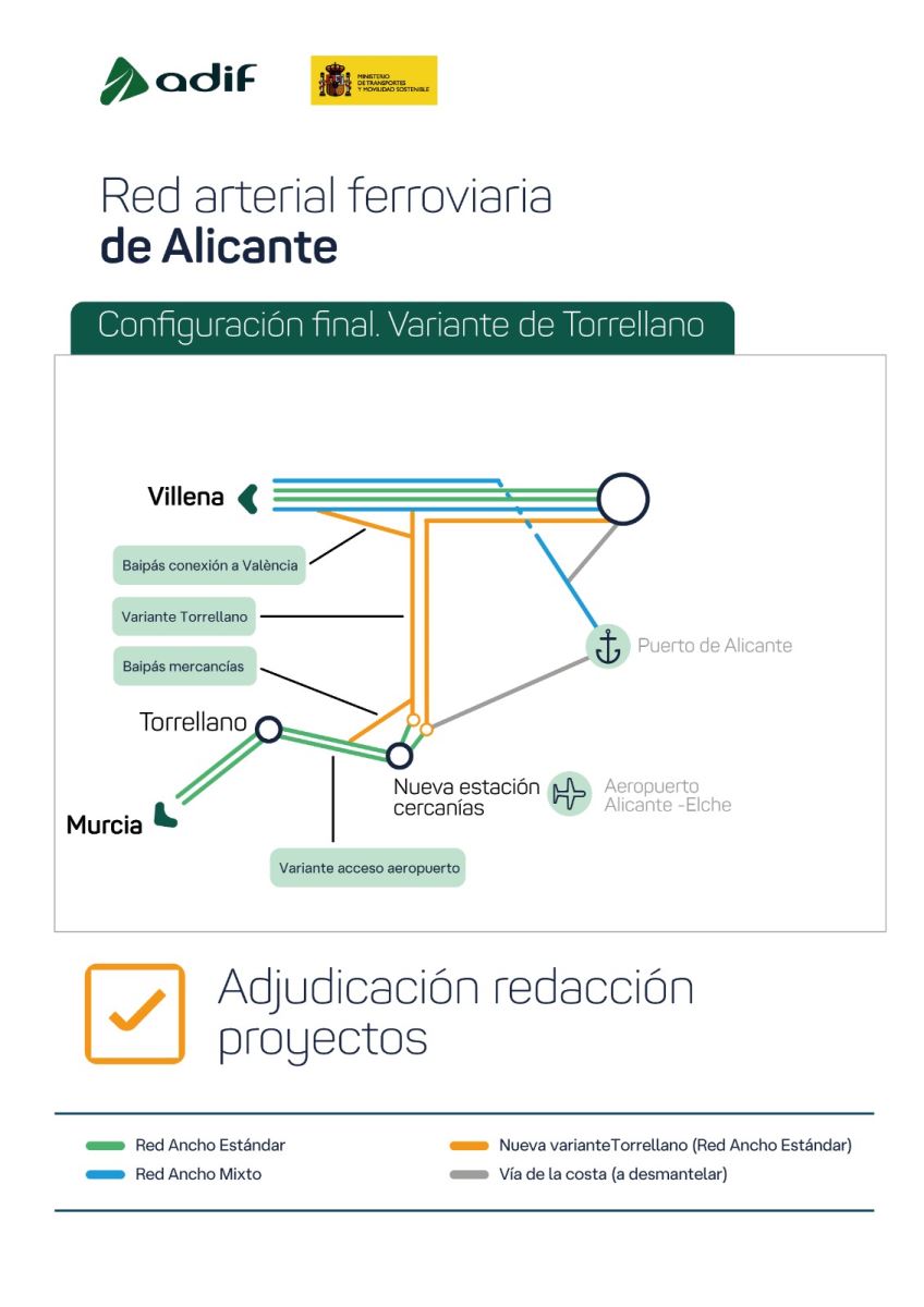 El Ministerio de Transportes y Movilidad Sostenible, a través de Adif, ha adjudicado por 5,1 millones de euros la redacción de los proyectos de la segunda fase de la variante de Torrellano, que completa el diseño de la nueva Red Arterial Ferroviaria de Alicante y permitirá el desmantelamiento de la vía de la costa en el entorno del barrio de San Gabriel.